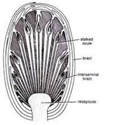 Ø The strobilus consists of a central ovuliferous receptacle surrounded by stamens (microsporophylls).