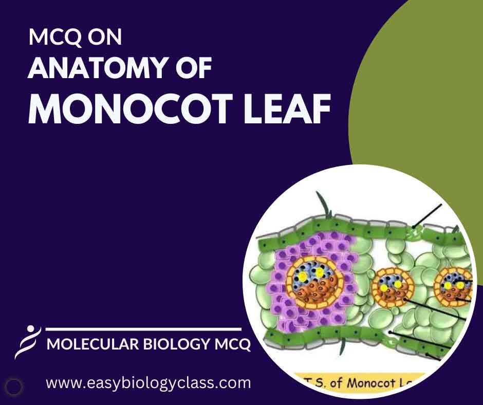 A monocot leaf has a single layer of epidermis with stomata for gas exchange. Vascular bundles are scattered throughout the ground tissue, lacking a distinct arrangement. The mesophyll contains parenchyma cells for photosynthesis. A waxy cuticle covers the leaf surface. This is an MCQ on Anatomy of Monocot Leaf with answer key.
