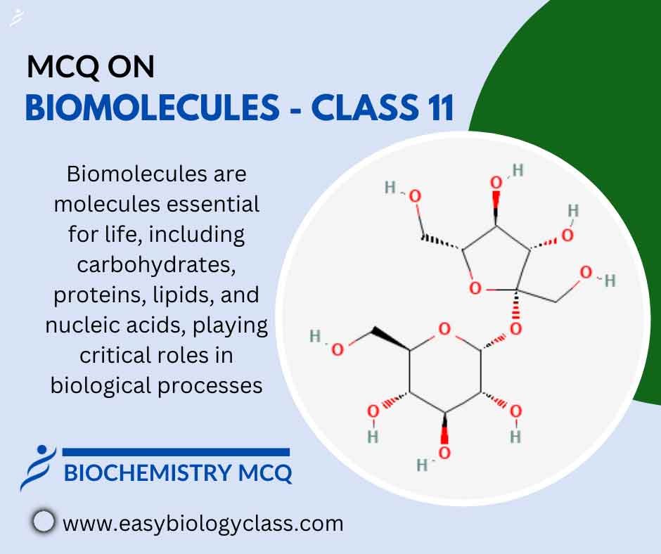 Biomolecules are molecules essential for life, present in all living organisms. They include carbohydrates, lipids, proteins, and nucleic acids, serving various functions like energy storage, structural support, information storage (DNA/RNA), and facilitating biological processes crucial for the sustenance and functioning of life forms. This is an MCQ on Biomolecules Class 11 will cover the intrductory concepts of biological macromolecules.