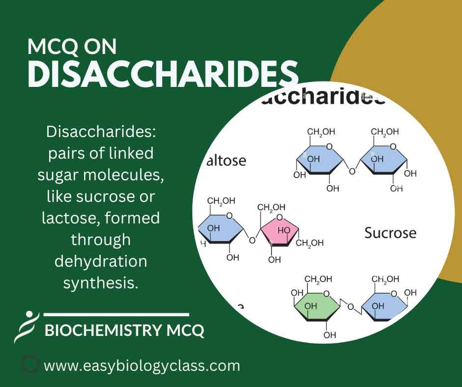 Disaccharides are sugar molecules composed of two monosaccharides linked together by a glycosidic bond. Common examples include sucrose (glucose + fructose), lactose (glucose + galactose), and maltose (glucose + glucose), serving as energy sources in food. This is an MCQ on Disaccharides: Structure, Functions and Examples