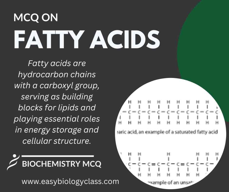 Fatty acids are essential building blocks of fats and oils, crucial for energy production and cell structure. They consist of hydrocarbon chains with a carboxyl group, and variations in length and saturation contribute to diverse biological functions. This is an MCQ on Fatty Acids Structure and Functions with Examples.