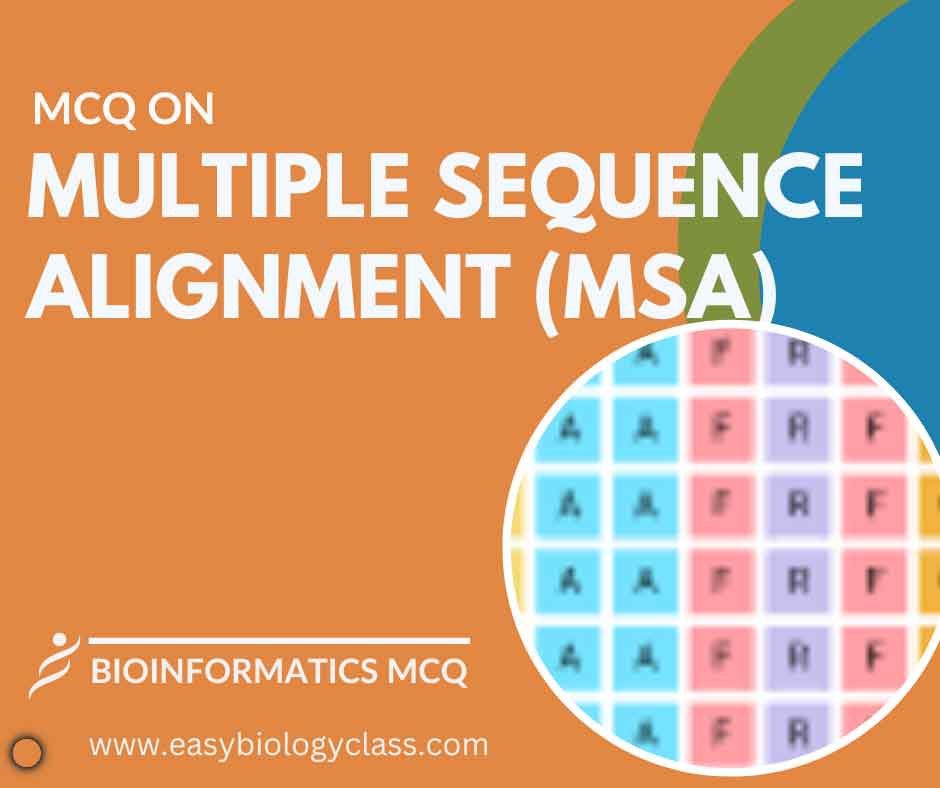 Multiple Sequence Alignment (MSA) is the process of aligning three or more biological sequences simultaneously. It aids in identifying conserved regions, understanding evolutionary relationships, and predicting functional elements. MSA methods include progressive alignment, iterative methods, and tools like Clustal Omega and MUSCLE. This is an MCQ on Multiple Sequence Alignment Principles and Applications.